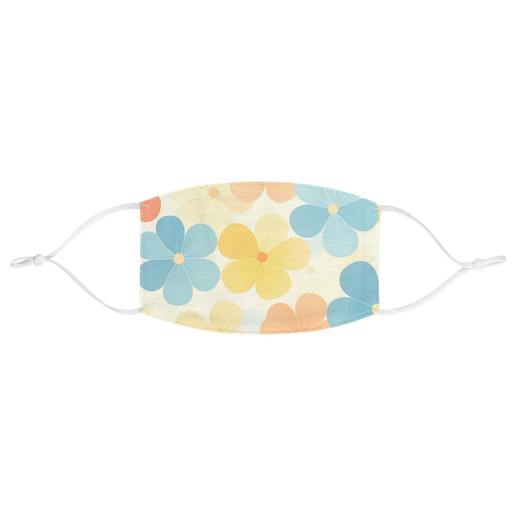 Lightweight and cheerful, this fabric face mask brings a soft, retro floral vibe to everyday wear. Two cloth layers of durable polyester hold bright, long-lasting color so the playful blue, yellow, and peach blooms keep their fresh look wash after wash. Silicone beads let you fine-tune the adjustable nylon-spandex earloops for a snug, comfortable fit that stays in place while you move. The contoured shape sits close to the face without feeling restrictive — great for quick errands, commuting, or layering under a jacket on breezy days. It reads like a little sunny moment: casual, confident, and quietly styled.