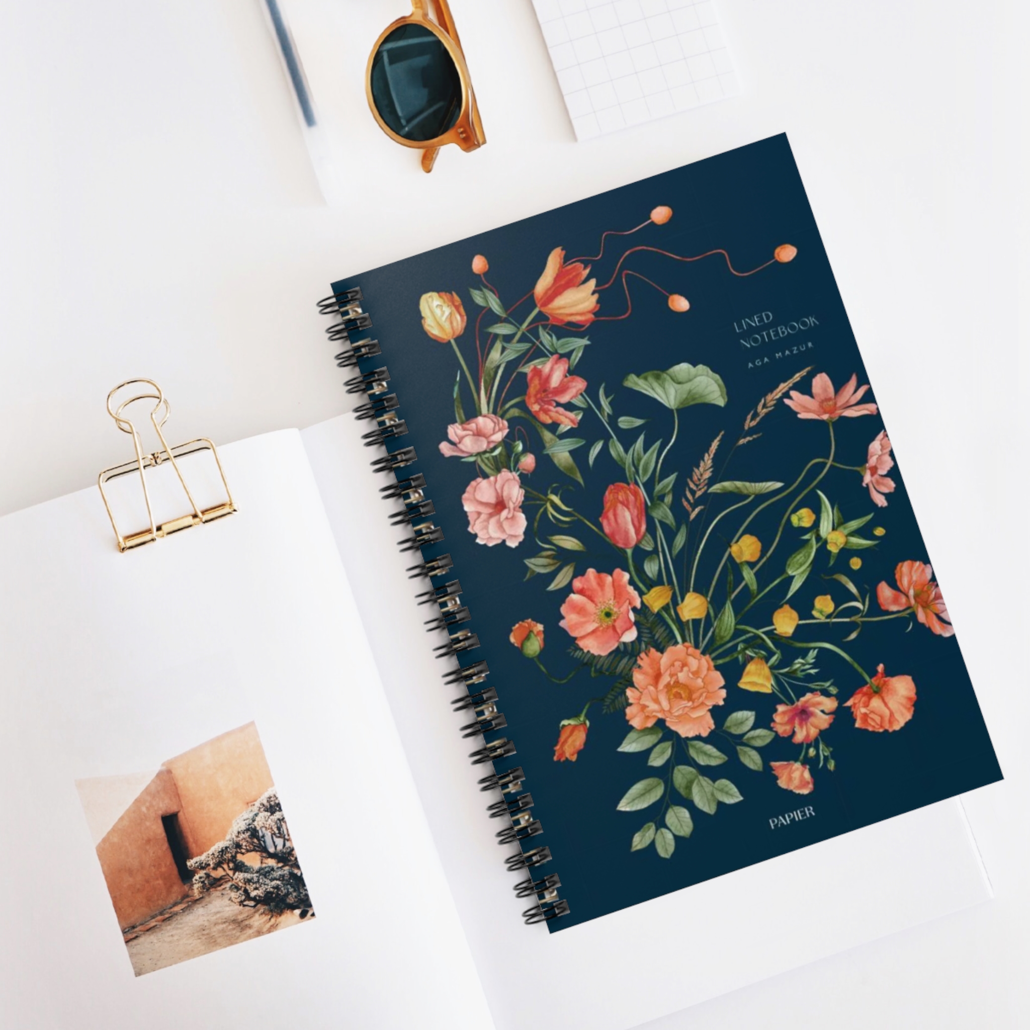 This spiral notebook brings calm, creative moments to your everyday notes. The deep navy cover is brushed with painterly wildflowers in warm apricot and coral — a soft, vintage-inspired floral that feels like a quiet morning in a sunlit studio. The metal spiral lets the book fold back easily while the ruled 90gsm pages take fountain pen, gel ink, and pencil without bleeding. A handy document pocket lives behind the dark grey back cover so receipts, clippings, or loose sketches stay with you. At 6 x 8 inches it slips into tote bags and backpacks and becomes the go-to place for to-do lists, daily journaling, class notes, and slow creative sketches.