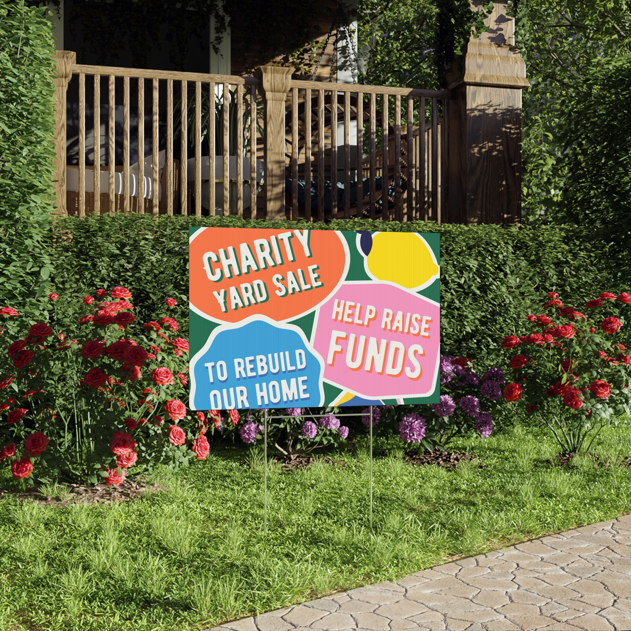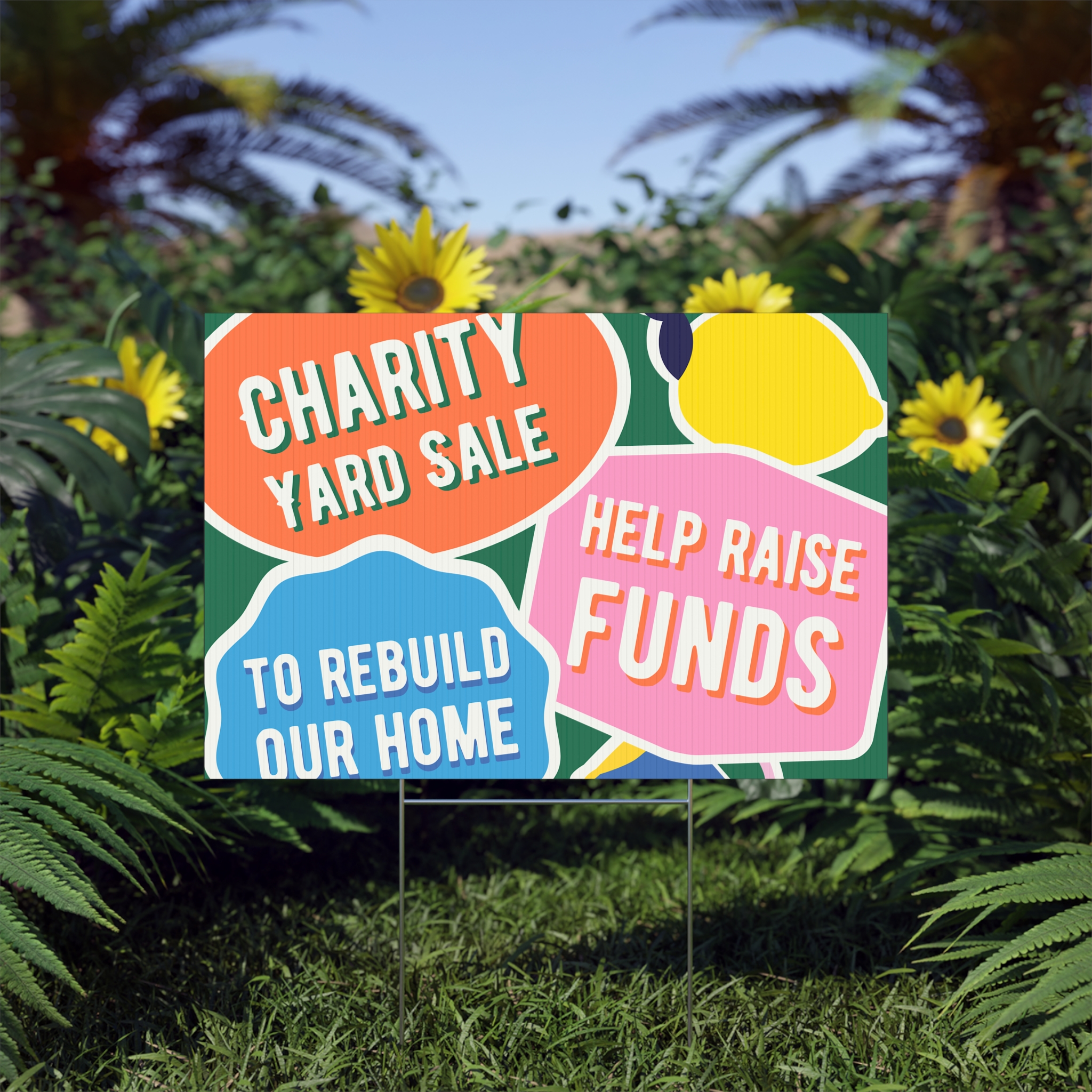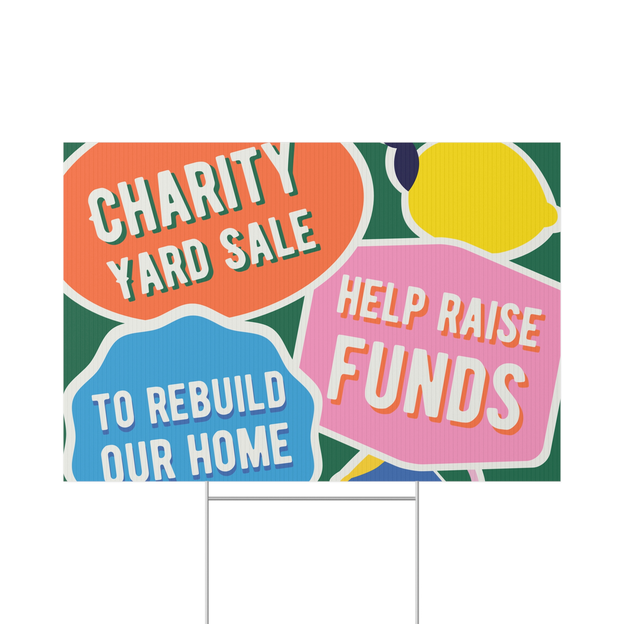 Bright, durable lawn sign made to shout your message from the curb. Printed on fluted polypropylene, the colors pop with modern, crisp inks that hold up through rain and sun. At 22″ x 15″ it’s large enough to catch passing attention without overwhelming the yard. The sign mounts easily on the included metal H-stake so you can place it in minutes for community sales, fundraisers, or neighborhood notices. One-sided print keeps the message focused and bold, while the sturdy, weather-resistant material keeps it readable through changing conditions.